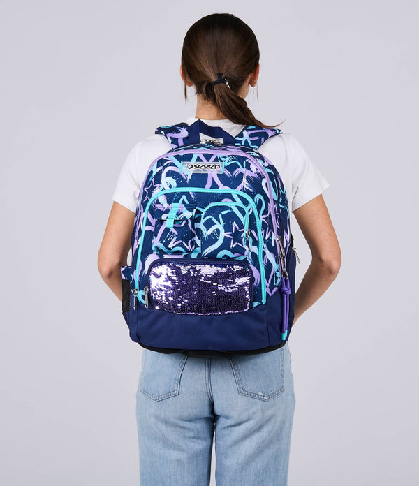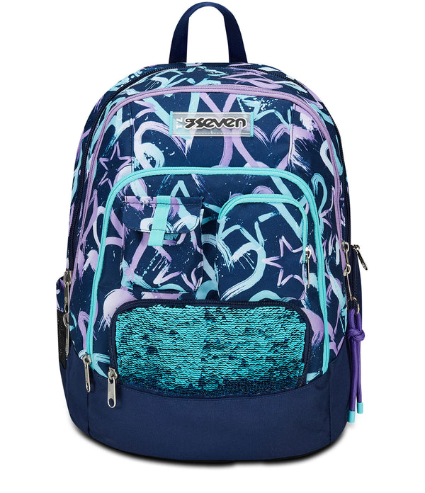 Rucksack mit zwei geräumigen Fächern und Pailletten auf der Vorderseite. Mit SEVEN Gummi-Logo.