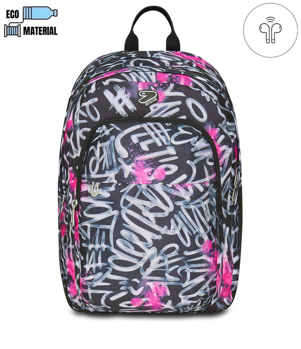 Mit dem Wende-Rucksack Seven The Double Pro XXL hast du drei Rucksäcke in einem: einen Doppelfach-Rucksack mit trendigem All-Over-Muster, einen Doppelfach-Rucksack mit einfarbigem Design, und einen Einzel-fach Rucksack. Nicht nur geräumig und vielseitig: Der Wende-Rucksack ist auch mit Kopfhörern ausgestattet. Er bietet Platz für alles, was du für den Tag brauchst – auch für deinen Laptop. Das Gewebe des Rucksacks besteht zu 100% aus recyceltem Polyester, das aus 33,5 PET-Flaschen gewonnen und GRS-zertifiziert ist.