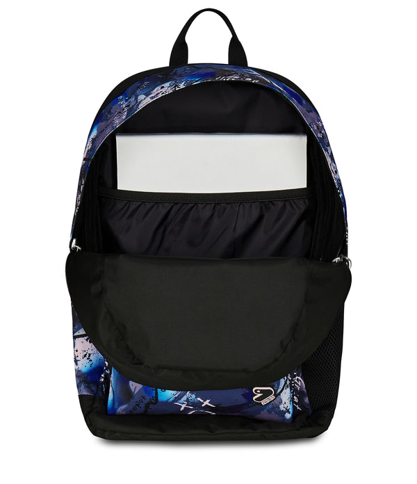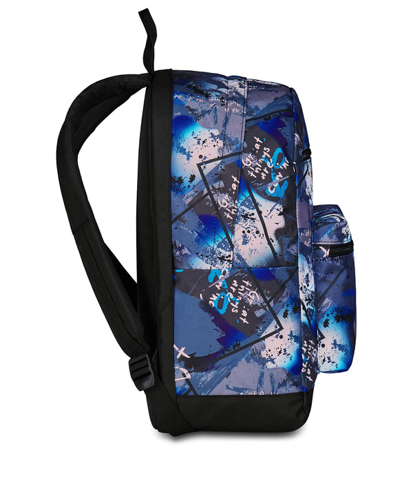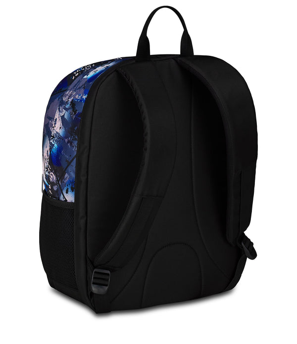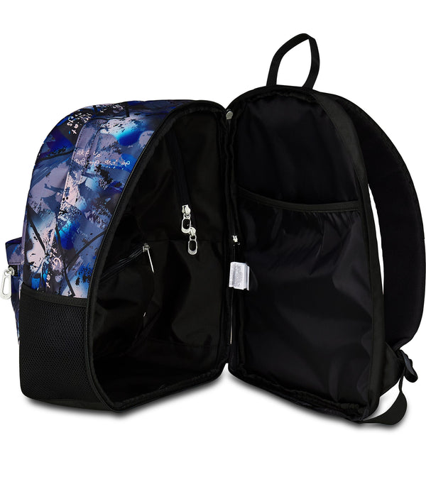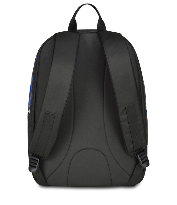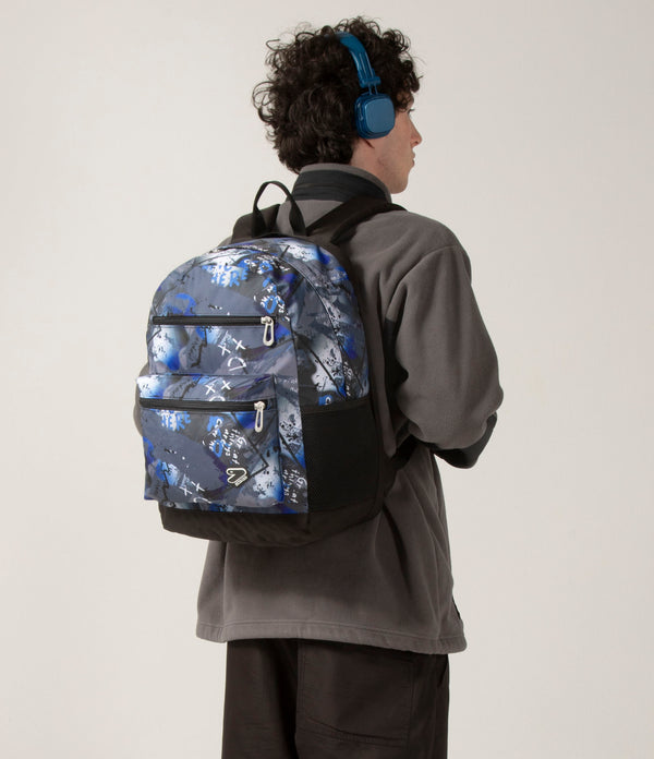- Wende-Rucksack mit kabellosen Kopfhörern und Stiften, um den Rucksack zu personalisieren. Eine Seite des Rucksacks ist einfarbig, die andere hat einen Allover-Print
