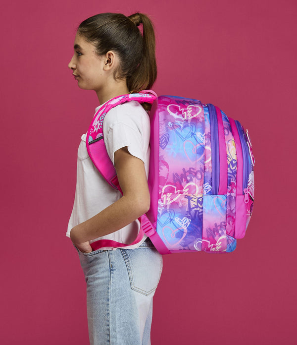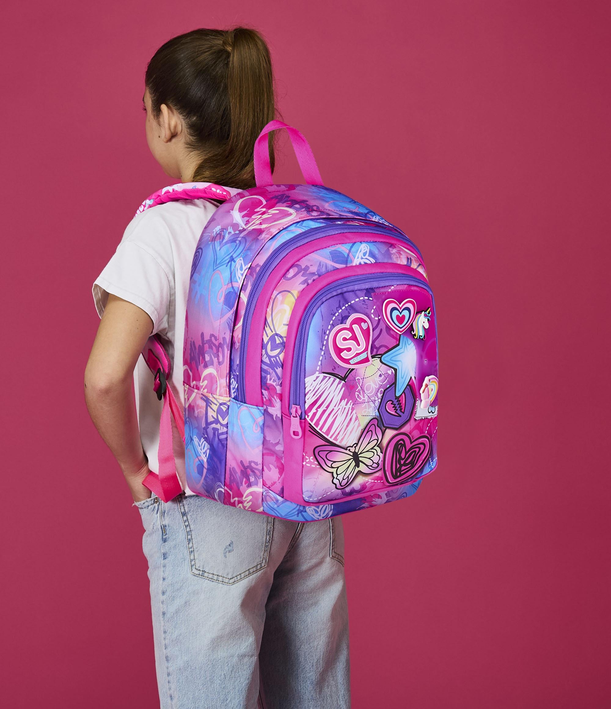 Ich bin bereit, dich fröhlich und mit viel Spaß zur Schule zu begleiten! Mein ergonomisches Rückenteil und die gepolsterten Schultergurte machen mich besonders bequem zu tragen, während mein integrierter Boden dafür sorgt, dass meine Form stabil bleibt auch bei voller Beladung. In meinem großen Doppelfach ist Platz für alles, was du im Laufe des Tages brauchst, und in der Seitentasche kannst du ganz praktisch deine Trinkflasche verstauen.