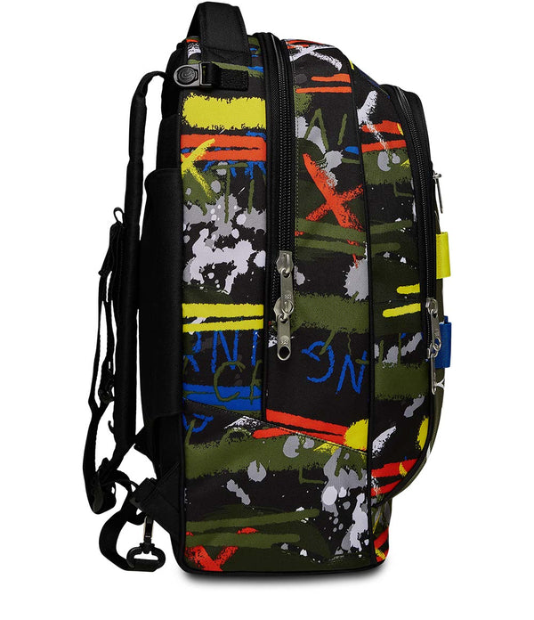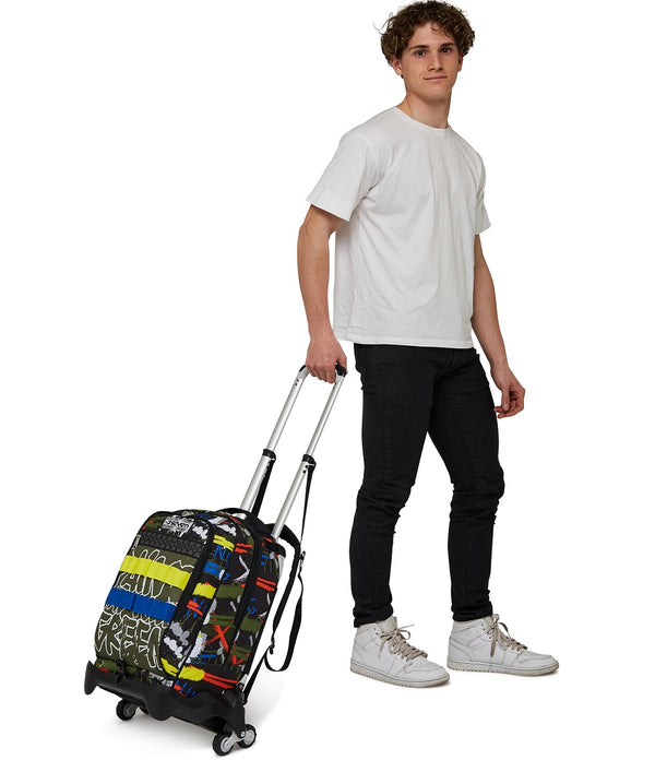 Vielseitiger Trolley mit 3-Räder-System (seitlich), höhenverstellbarem Griff, vorgeformtem Boden und verstärkten Ecken. Mit Crossover-System ausgestattet: Die Schultergurte können an die Stange festgelegt werden, um das Reiben am Boden zu vermieden. 3 Verwendungsmöglichkeiten: Als Trolley, als Rucksack mit Trolley-Einsatz, und als Rucksack, wenn er vollständig vom Trolley entfernt wird