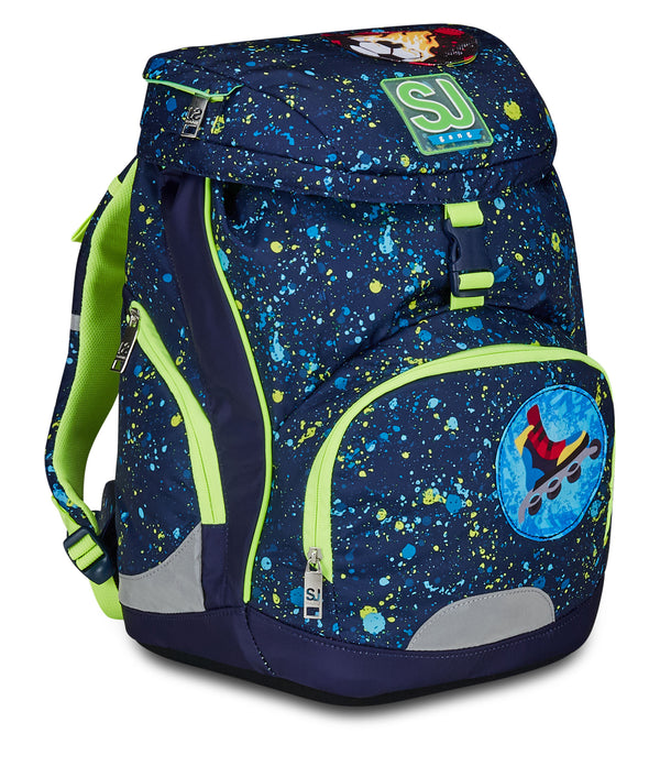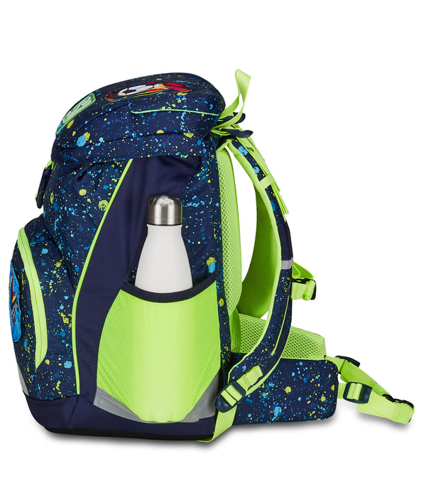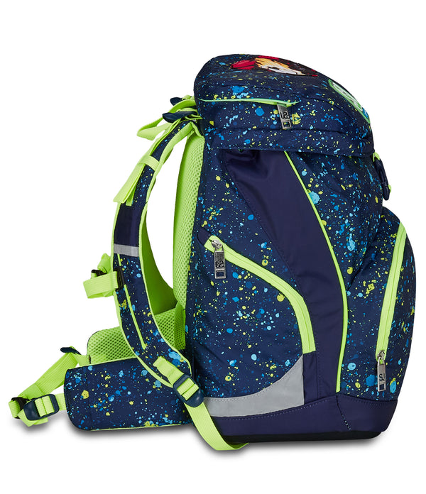 - Anatomical shaping with reflective inserts. Innovative shoulder strap adjustment system for the correct fit according to the possible different heights of children. Side shoulder blocking straps, with release possibility to allow adjastment.