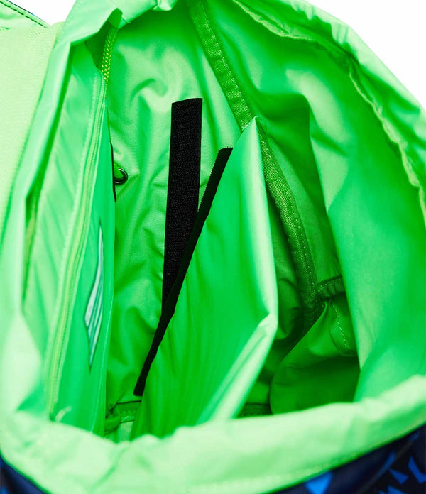 Removable padded inner divider with Velcro fastening. Flap with gear pocket and internal mesh pocket. Name tag. Front pocket extendable inwards. Internal load compression system.