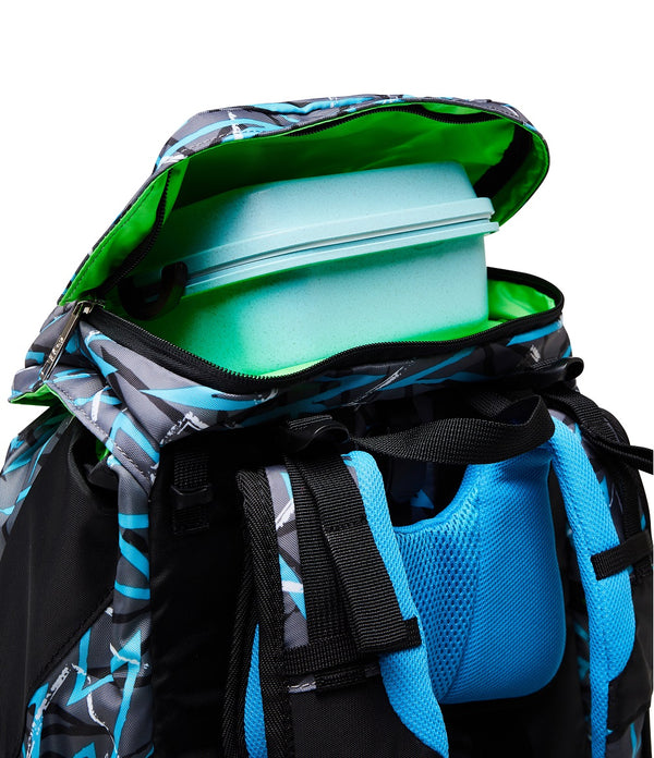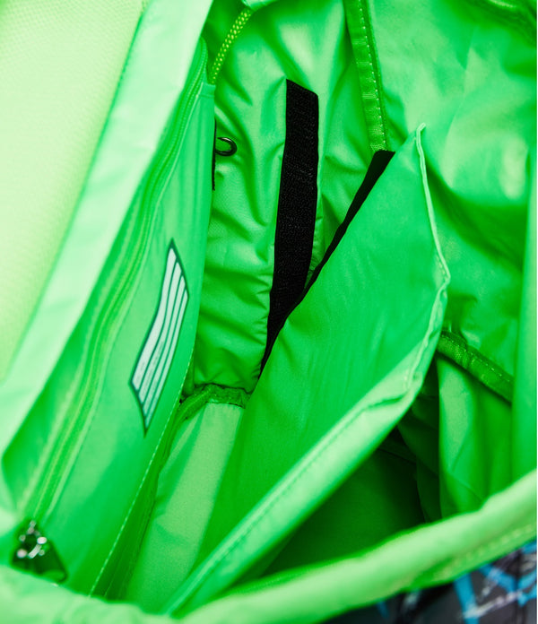 Removable padded inner divider with Velcro fastening. Flap with gear pocket and internal mesh pocket. Name tag. Front pocket extendable inwards. Internal load compression system.