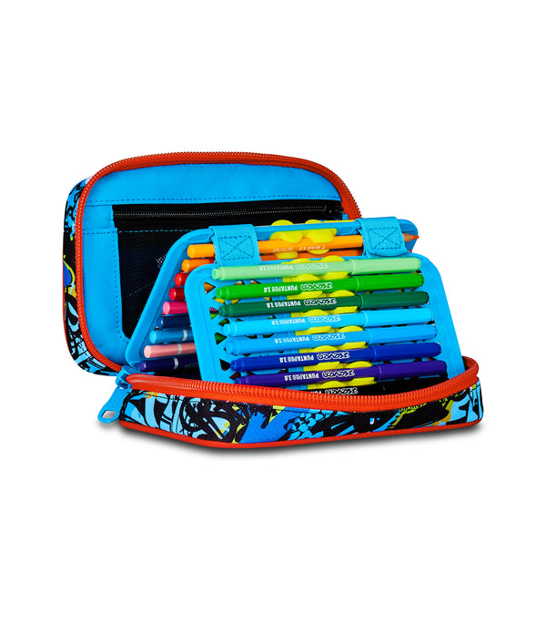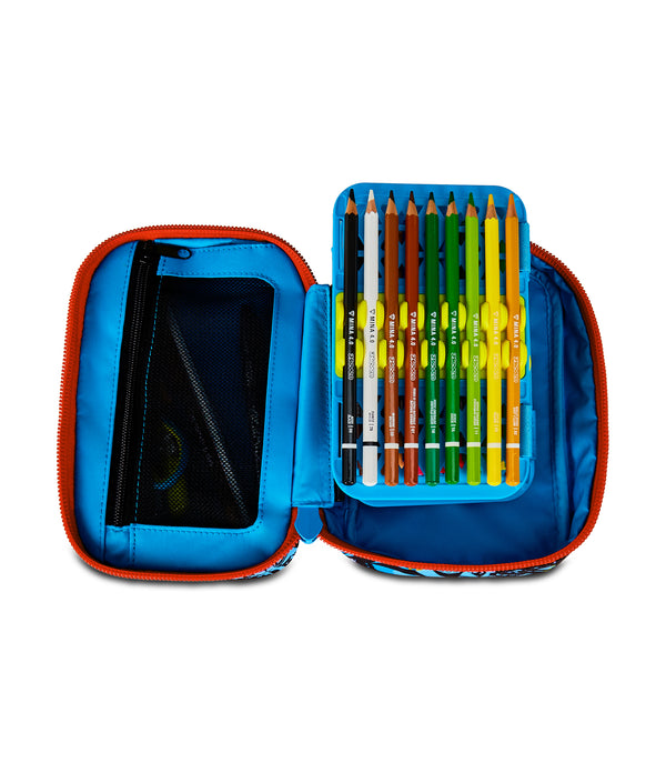 - Single opening via maxi zip, removable planks, flexible rubber hooks for stationery. Contains 44 pieces: 1 erasable blue pen, 1 erasable red pen, 18 felt-tip pens, 18 colored pencils, 1 graphite pencil, 1 eraser, 1 barrel sharpener, 1 glue stick, 1 ruler, 1 metal scissors with plastic handle.