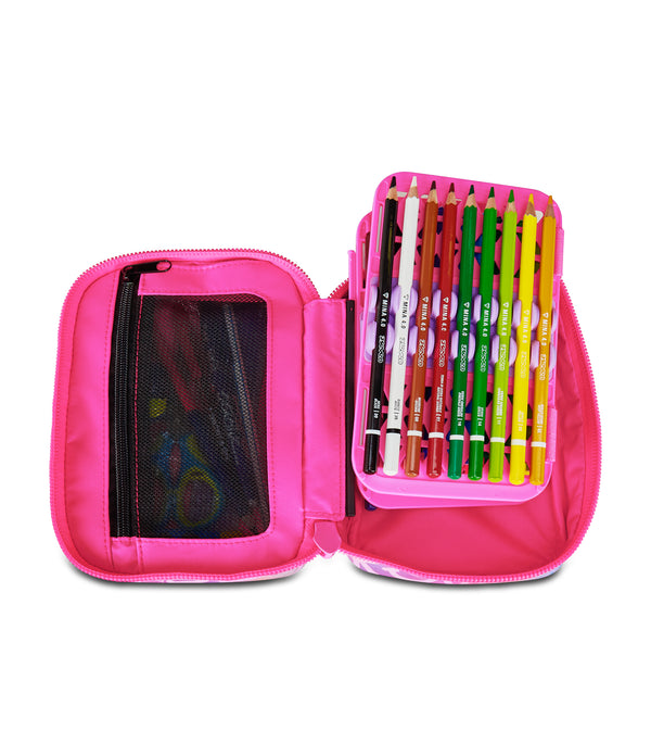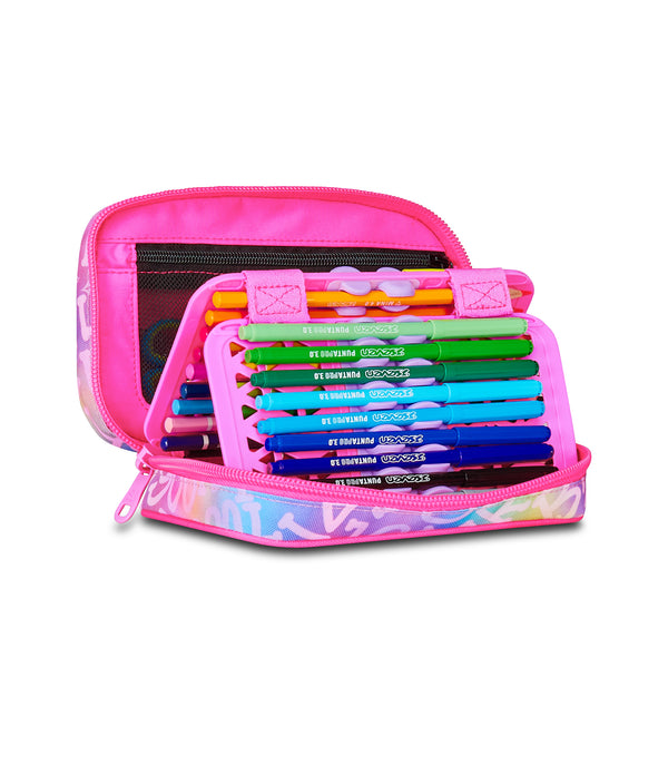 - Single opening via maxi zip, removable planks, flexible rubber hooks for stationery. Contains 44 pieces: 1 erasable blue pen, 1 erasable red pen, 18 felt-tip pens, 18 colored pencils, 1 graphite pencil, 1 eraser, 1 barrel sharpener, 1 glue stick, 1 ruler, 1 metal scissors with plastic handle.