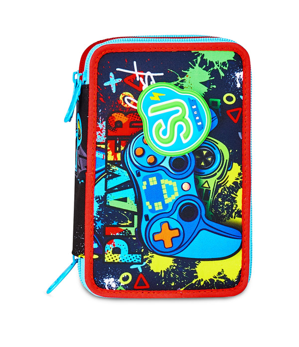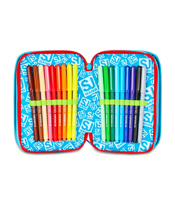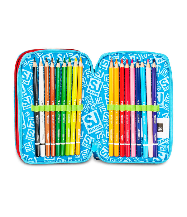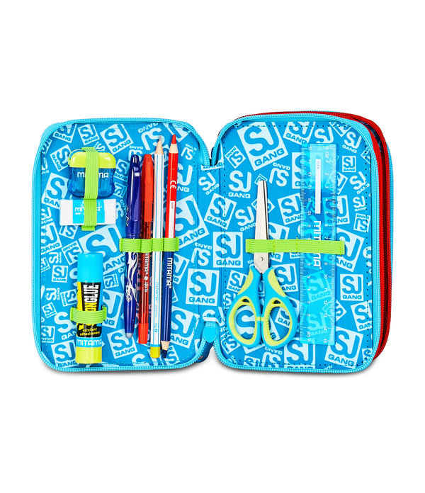 Hi! I am the colorful SJ Gang triple zipper pencil case. I am equipped with 3 compartments and everything you need for school. Match me with an SJ Gang backpack or trolley.