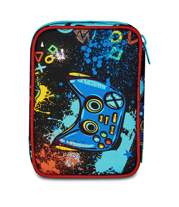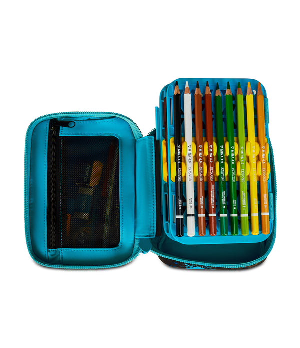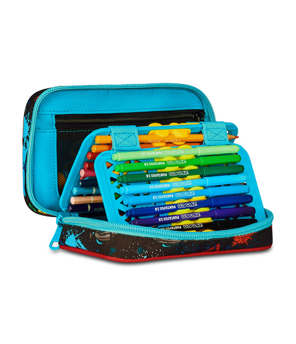 - Single opening via maxi zip, removable planks, flexible rubber hooks for stationery. Contains 44 pieces: 1 erasable blue pen, 1 erasable red pen, 18 felt-tip pens, 18 colored pencils, 1 graphite pencil, 1 eraser, 1 barrel sharpener, 1 glue stick, 1 ruler, 1 metal scissors with plastic handle.