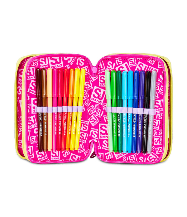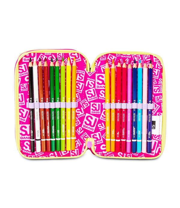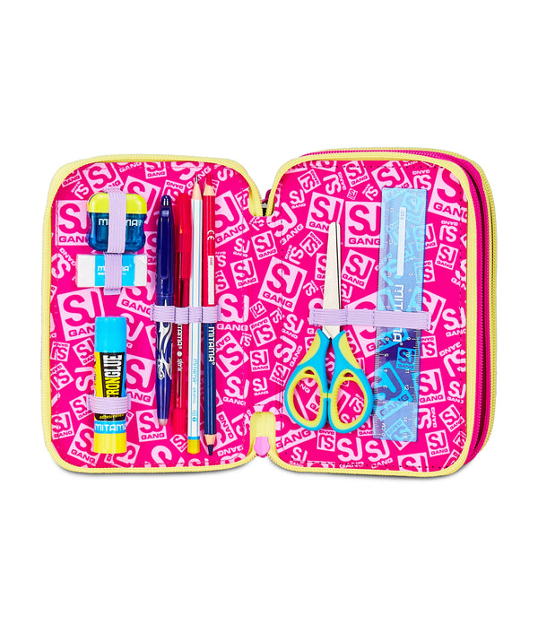Hi! I am the colorful SJ Gang triple zipper pencil case. I am equipped with 3 compartments and everything you need for school. Match me with an SJ Gang backpack or trolley.