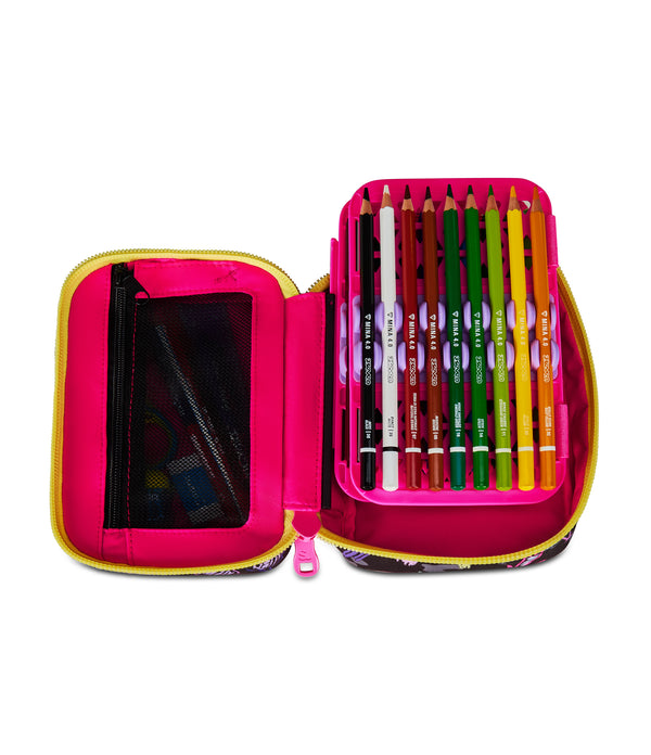 Single opening via maxi zip, removable planks, flexible rubber hooks for stationery. Contains 44 pieces: 1 erasable blue pen, 1 erasable red pen, 18 felt-tip pens, 18 colored pencils, 1 graphite pencil, 1 eraser, 1 barrel sharpener, 1 glue stick, 1 ruler, 1 metal scissors with plastic handle.