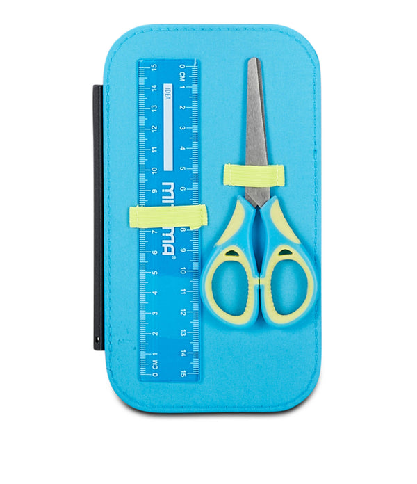 Contains 44 pieces: 1 erasable blue pen, 1 erasable red pen, 18 felt-tip pens, 18 colored pencils, 1 graphite pencil, 1 eraser, 1 two hole barrel sharpener, 1 glue stick, 1 ruler, 1 metal scissors with plastic handle.