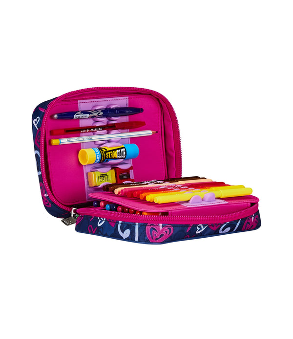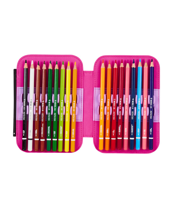 - 44 Pieces: 18 Colored pencils, 18 Washable felt-tip pens, 1 Erasable pen - Blue , 1 Erasable pen - Red, 1 Graphite Pencil, 1 Rubber, 1 Pencil sharpener, 1 Glue stick, 1 Transparent ruler, 1 Scissor