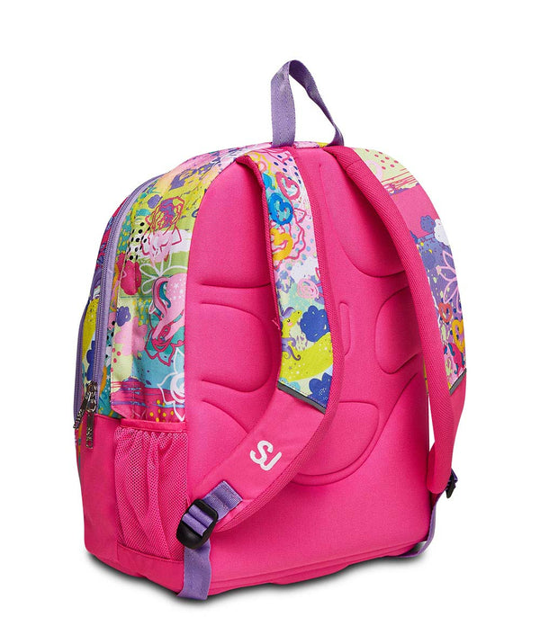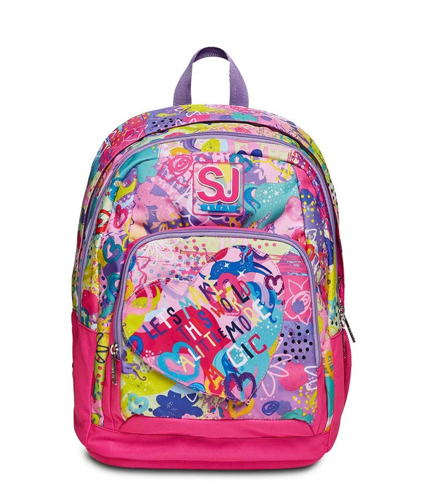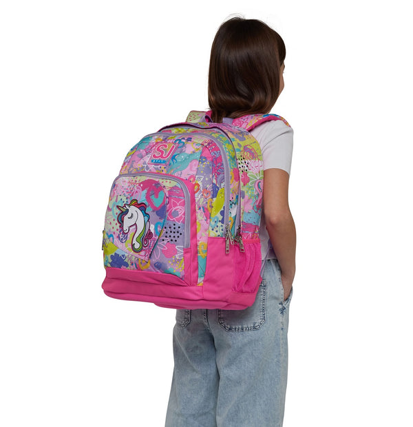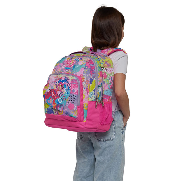 Hi there! I’m the amazing ADVANCED backpack: the expandable backpack from SJ GANG, perfect for going to school cheerfully and carefree. Thanks to the flip system on the front pocket, you’ll enjoy changing my look whenever you like! Flip the flap and choose the pattern you like the most! There’s enough space for your books, notebooks, and more thanks to the two compartments and the front pocket. Don’t worry about spilling water on your belongings, you can put the water bottle in the external lateral pocket. Last but not least, my shoulder straps are comfortable as is the back panel. The integrated bottom ensures that the shape of the backpack stays unaltered, even when fully loaded.