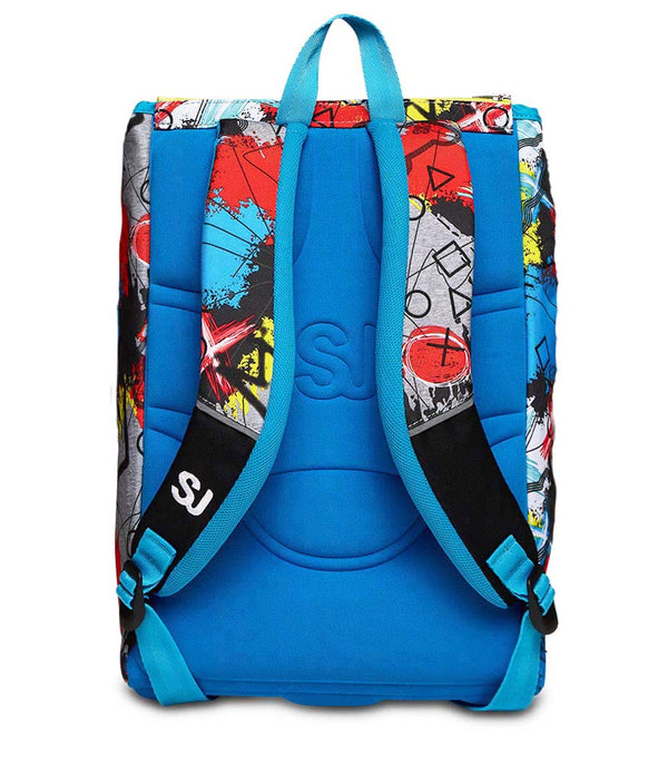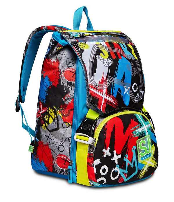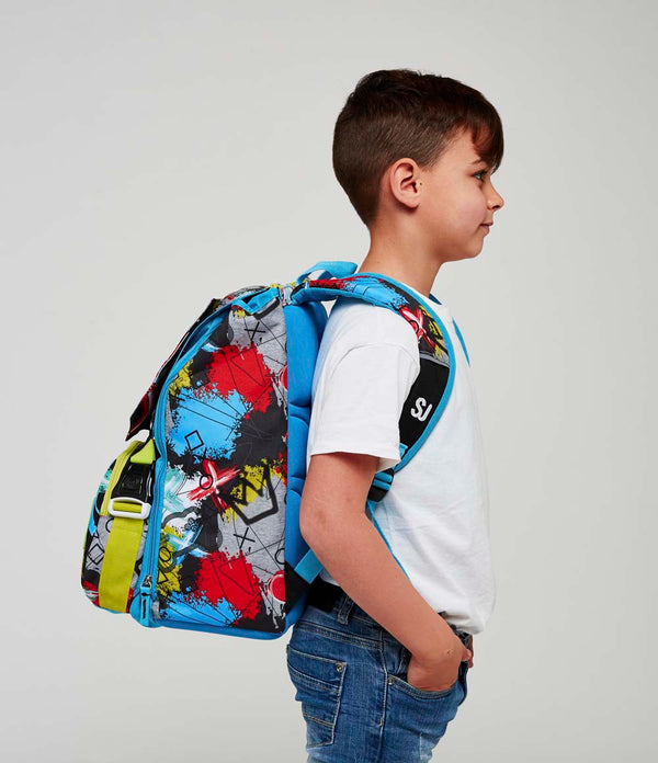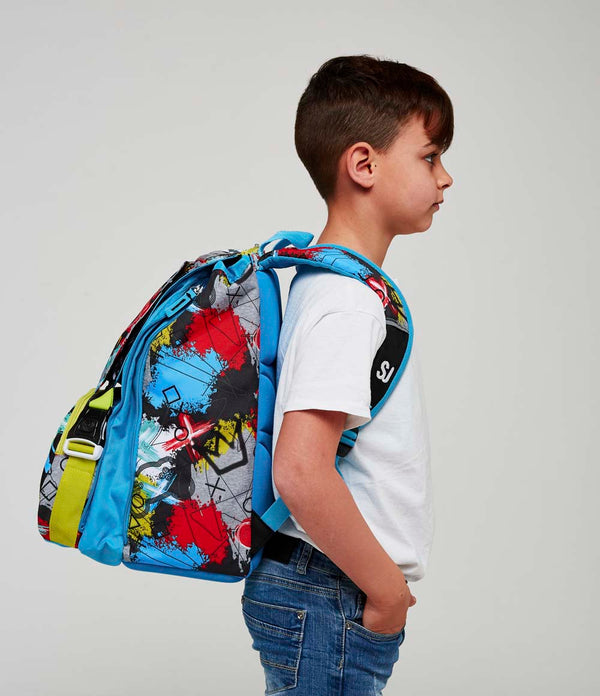 Hi there! I’m GLITZLED BOY: the expandable backpack from SJ GANG, perfect for going to school but also to play with. Thanks to the flip system, you’ll enjoy changing my look whenever you like! Flip the flap, turn on the shiny LEDs, and choose the pattern you like the most! There’s enough space for your books, notebooks, and more thanks to the two compartments and the front pocket, but if you need more space you can easily increase capacity using the lateral zippers. Last but not least, my shoulder straps are comfortable as is the back panel. The integrated bottom ensures that the shape of the backpack stays unaltered, even when fully loaded.
