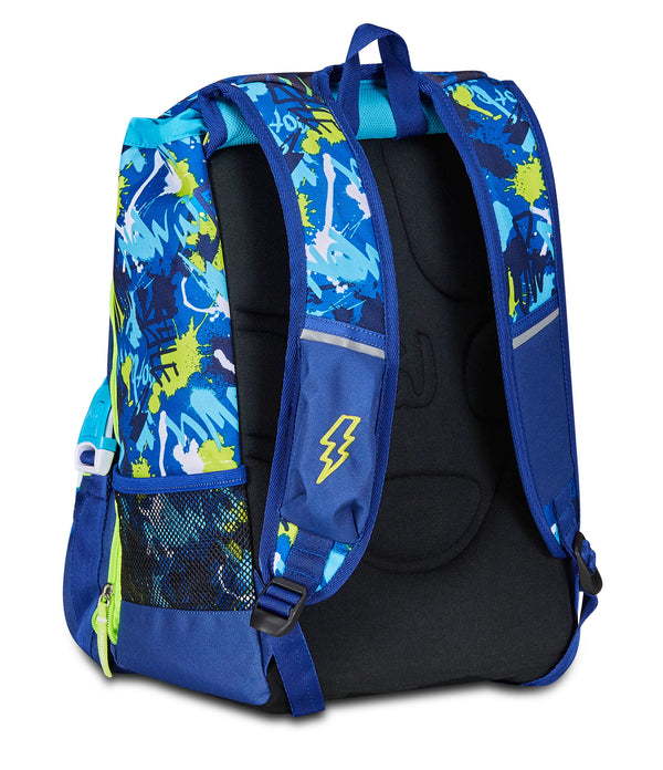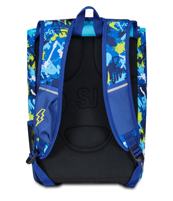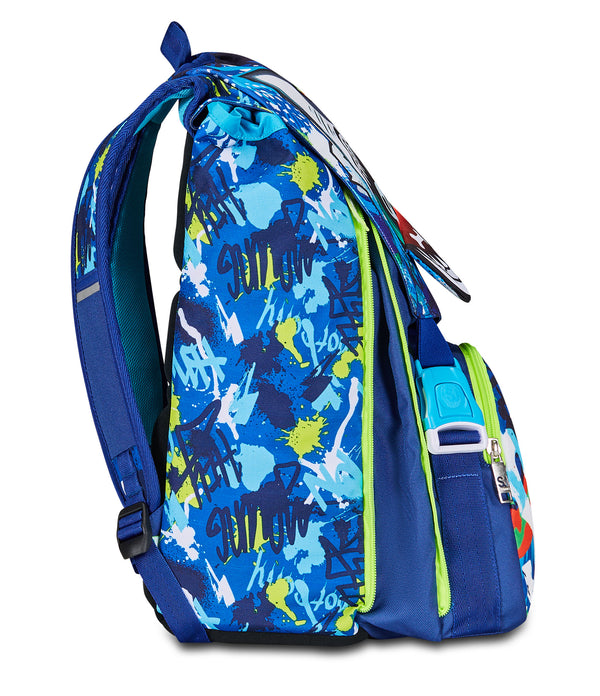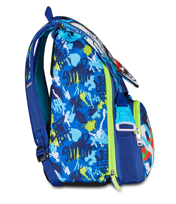 Hi! I am SHARKSTORY, the SJ GANG extendable backpack you go to school with, but you can also play. In fact, on my front I have a scary shark which you can controll by making him opening or closing his mouth thanks to air system from the pressure shoulder straps! I have a very spacious compartment, of which you can easily increase the capacity through the side zippers to be able to accommodate and distribute books, notebooks and everything you need for your day, being able to take advantage of the front pocket and the bottle pocket. In addition, they are really comfortable to wear on the shoulders, thanks to comfortable back and shoulder straps. In addition, the integrated bottom keeps my structure unchanged, ensuring the stability of the content even at full load.