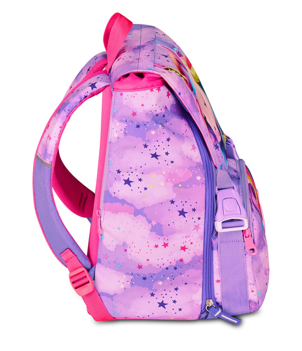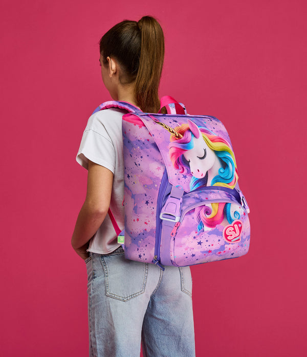 Hello! I’m the fabulous FABLE JOURNEY, the expandable SJ GANG backpack with a sparkling finish for school and play. Open the side zips and reveal the printed MAXI FLAPS to transform me into a WINGED UNICORN! I have a spacious double compartment that expands easily thanks to the side zippers so you can carry and organize your books, notebooks and everything you need for your day in the best possible way, also making use of the front pocket. I’m very easy to carry thanks to the comfortable shoulder straps and backrest. Moreover, the integrated base keeps my structure intact and ensures the stability of your stuff, even when fully loaded.