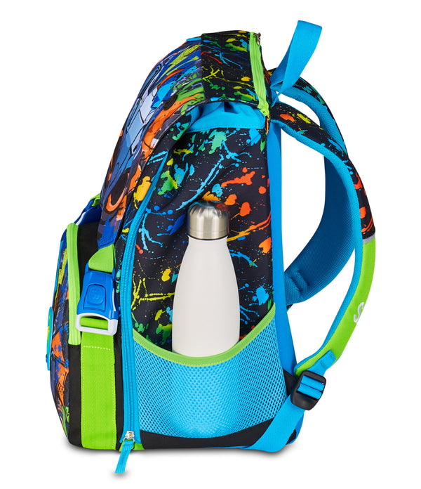 Hello! I’m LED LOOK, the expandable SJ GANG backpack for school, but also for play. Have fun lighting up the EYES on the flap as many times as you want! You can use the ON/OFF button to activate the LIGHTING MOVING EYES effect. The device is USB rechargeable and built into a removable flap, so the backpack is washable. I have a spacious double compartment that expands easily thanks to the side zippers so you can carry and organize your books, notebooks and everything you need for your day in the best possible way, also making use of the front pocket and the water bottle pocket. I’m very easy to carry, thanks to the comfortable backrest and shoulder straps. Moreover, the integrated base keeps my structure intact and ensures the stability of your stuff, even when fully loaded.