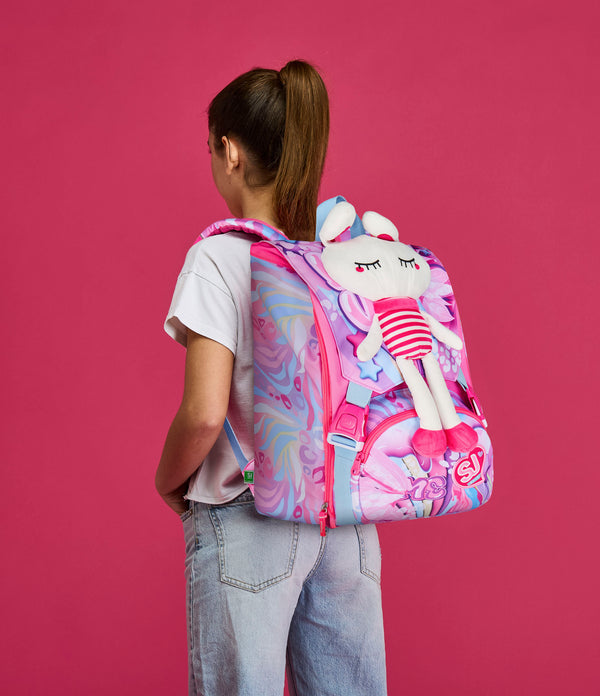 Hello! I’m PLUSHY RABBIT, the expandable SJ GANG backpack for school and with which you can play by lifting the soft PLUSH BUNNY ‘S EARS! I have a spacious double compartment that expands easily thanks to the side zippers, so you can carry and organize your books, notebooks and everything you need for your day in the best possible way, also making use of the front pocket. I’m very easy to carry thanks to the comfortable shoulder straps and backrest. Moreover, the integrated base keeps my structure intact and ensures the stability of your stuff, even when fully loaded.