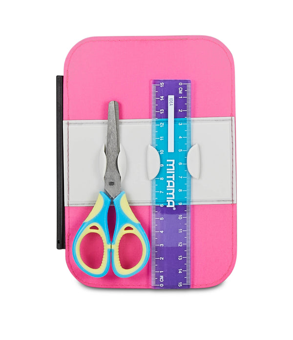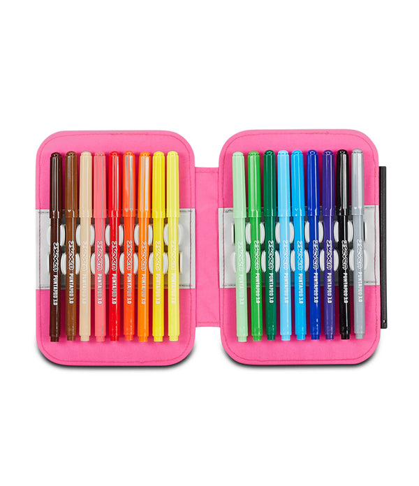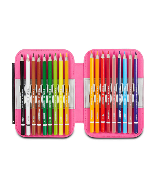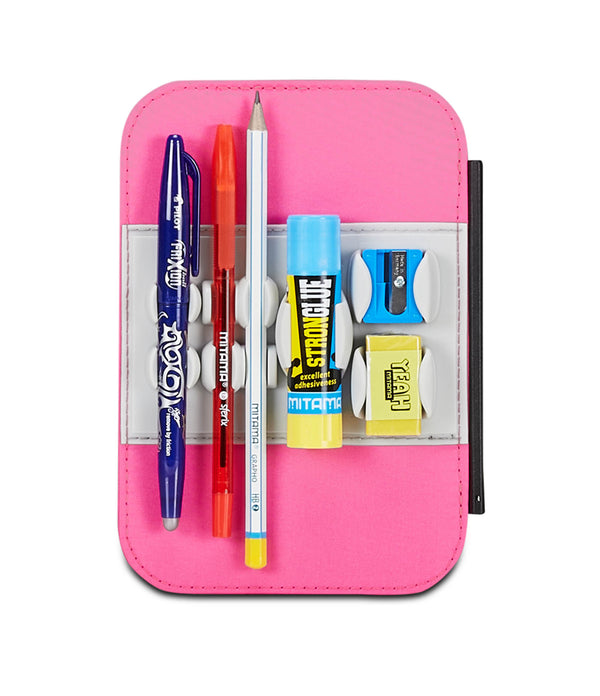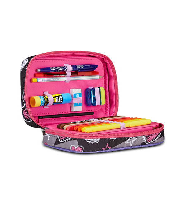 Single opening via maxi zip, removable planks, internal elastic bands for stationery. CONTENTS 44 PIECES: 1 erasable pen blue, 1 erasable pen red, 18 felt-tip pens, 18 colored pencils, 1 graphite HB pencil, 1 eraser, 1 two hole barrel sharpener, 1 glue stick, 1 ruler, 1 metal scissors.