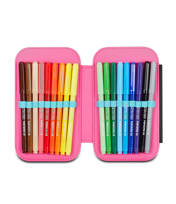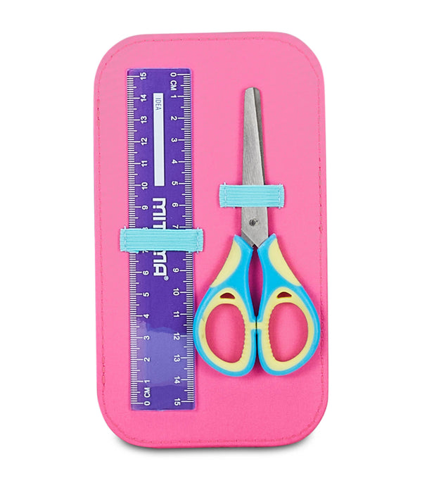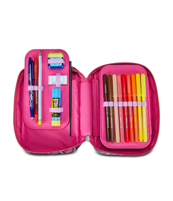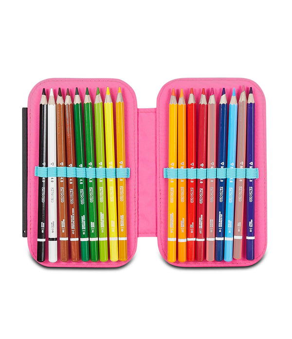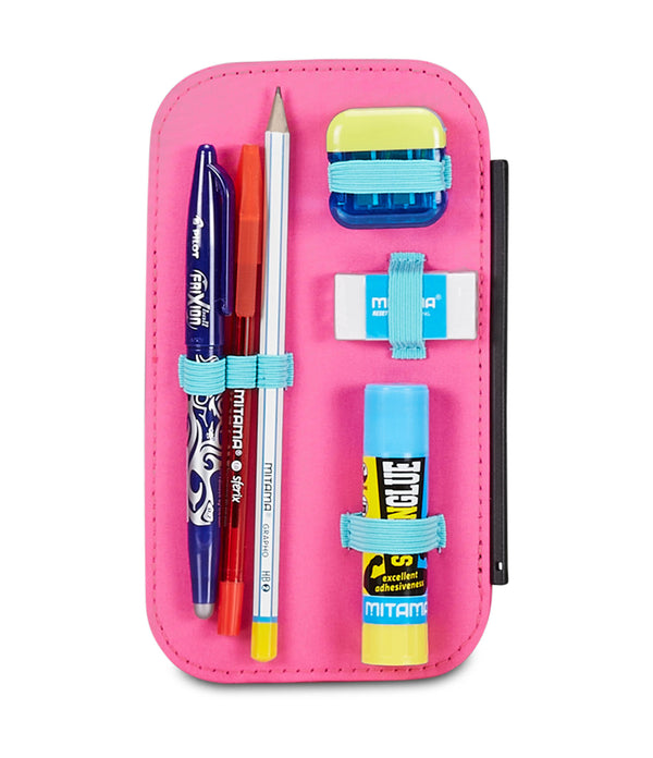 - Single opening via maxi zip, removable planks, internal elastic bands for stationery. CONTENTS 44 PIECES: 1 erasable pen blue, 1 erasable pen red, 18 felt-tip pens, 18 colored pencils, 1 graphite HB pencil, 1 eraser, 1 two hole barrel sharpener, 1 glue stick, 1 ruler, 1 metal scissors.