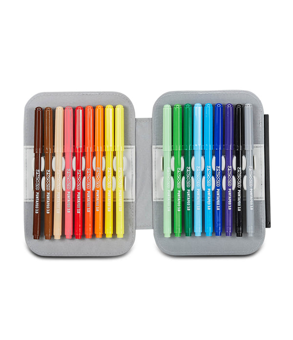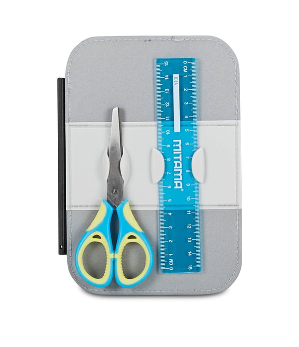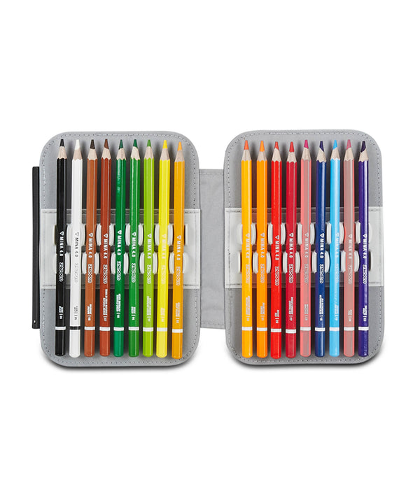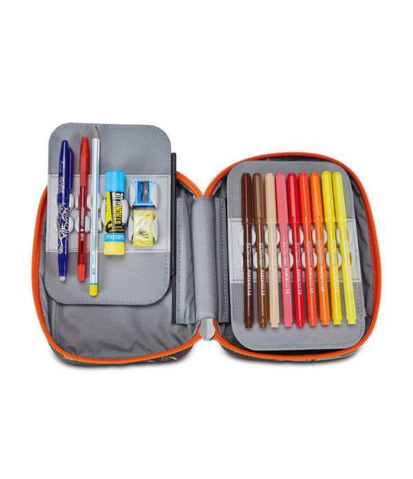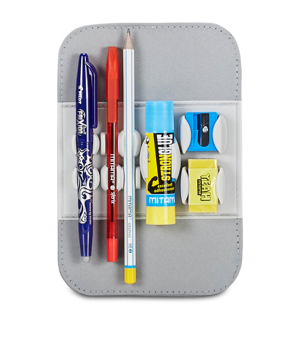 - Single opening via maxi zip, removable planks, flexible rubber hooks for stationery. CONTENTS 44 PIECES: 1 erasable pen blue, 1 erasable pen red, 18 felt-tip pens, 18 colored pencils, 1 graphite HB pencil, 1 eraser, 1 two hole barrel sharpener, 1 glue stick, 1 ruler, 1 metal scissors.