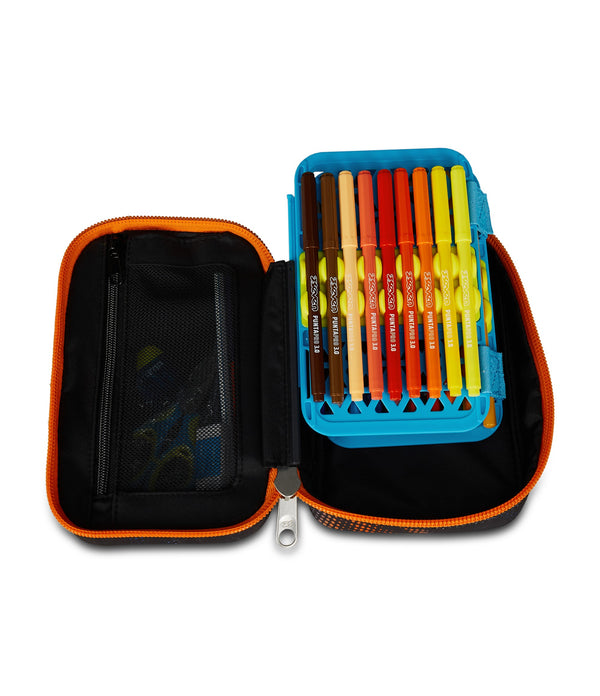 - Single opening via maxi zip, removable planks, flexible rubber hooks for stationery. CONTENTS 44 PIECES: 1 erasable pen blue, 1 erasable pen red, 18 felt-tip pens, 18 colored pencils, 1 graphite HB pencil, 1 eraser, 1 two hole barrel sharpener, 1 glue stick, 1 ruler, 1 metal scissors.