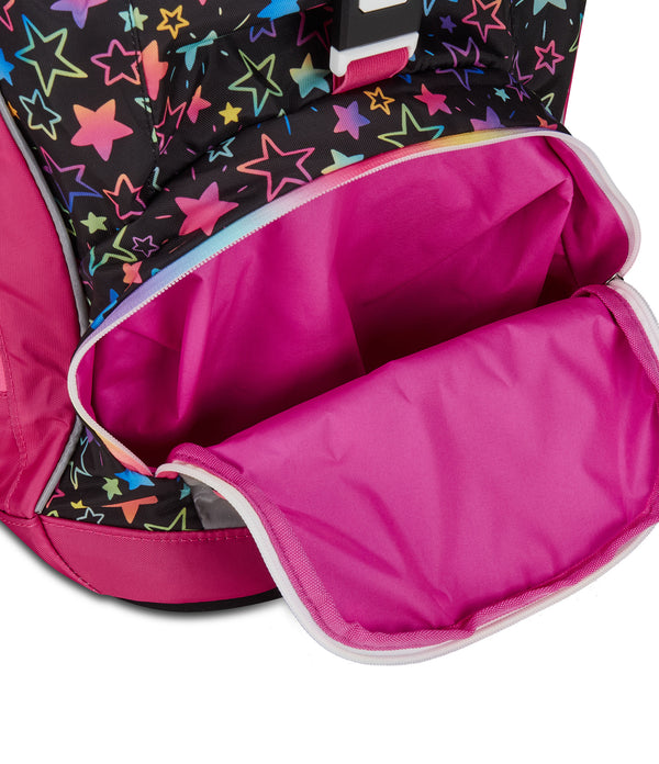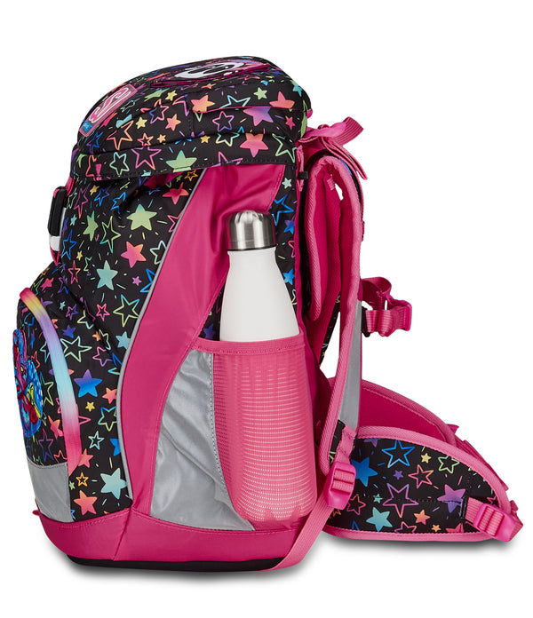 - Vordertasche mit herausnehmbarem Innenfach. Seitentasche mit Reißverschluss. Netzaußentasche für Trinkflasche. Klappe mit großer Tasche für Schulmaterial und flacher Netzinnentasche.