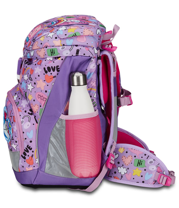 - Vordertasche mit herausnehmbarem Innenfach. Seitentasche mit Reißverschluss. Netzaußentasche für Trinkflasche. Klappe mit großer Tasche für Schulmaterial und flacher Netzinnentasche.