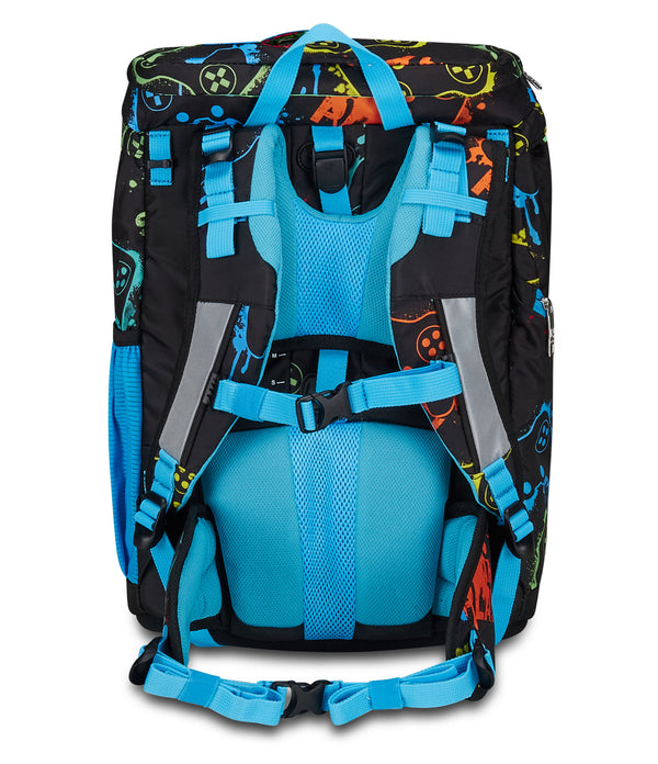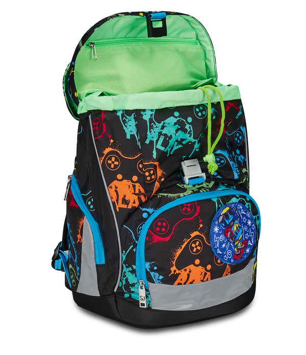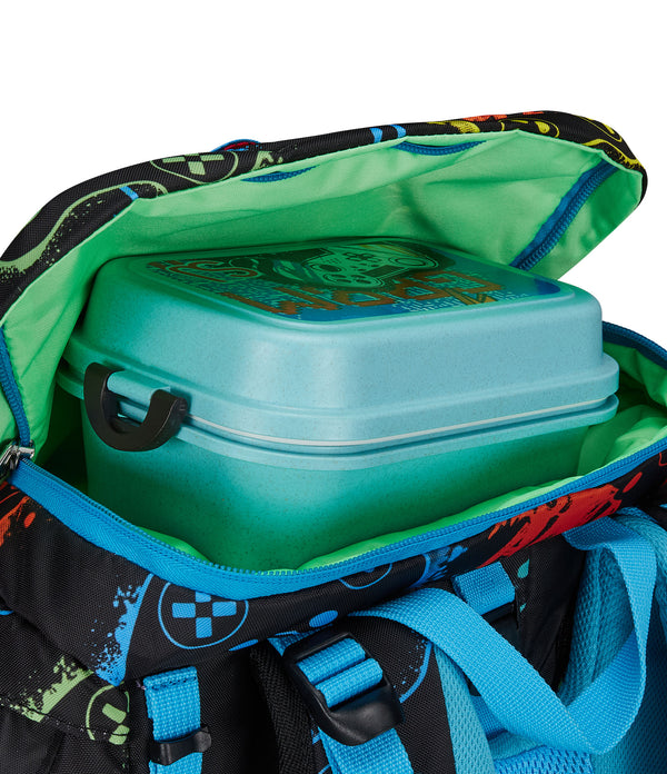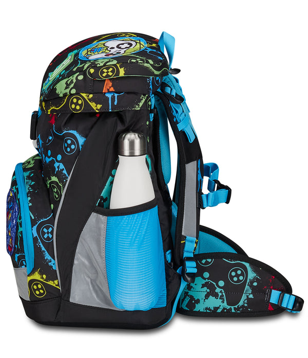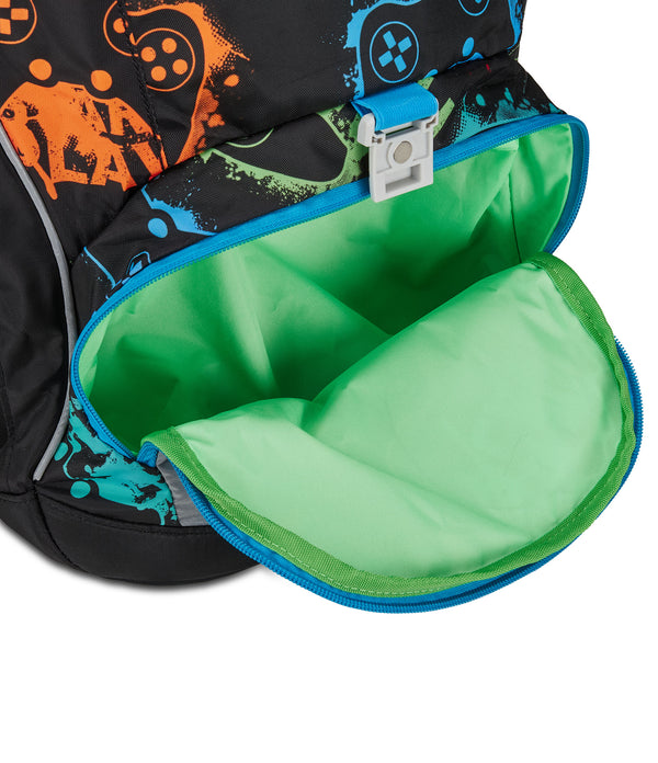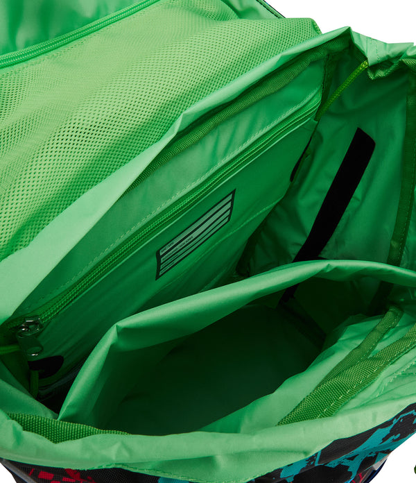- Vordertasche mit herausnehmbarem Innenfach. Seitentasche mit Reißverschluss. Netzaußentasche für Trinkflasche. Klappe mit großer Tasche für Schulmaterial und flacher Netzinnentasche.