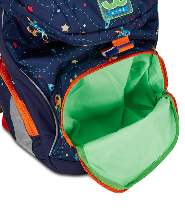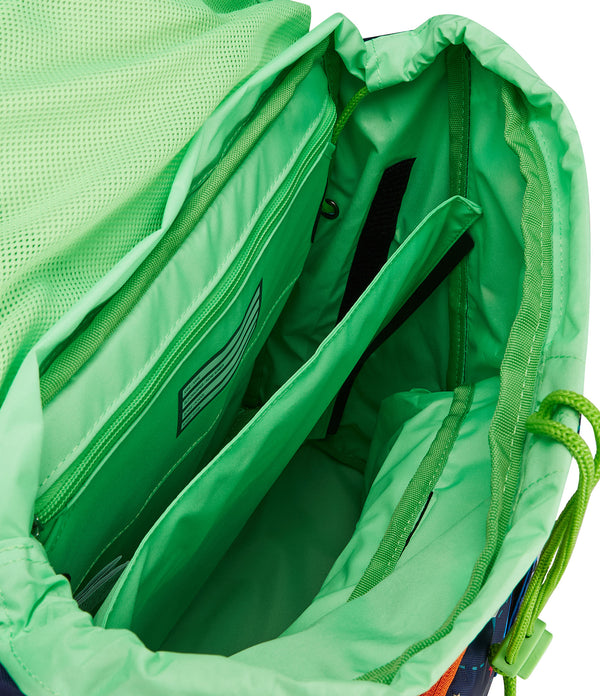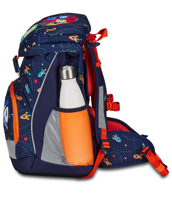 - Vordertasche mit herausnehmbarem Innenfach. Seitentasche mit Reißverschluss. Netzaußentasche für Trinkflasche. Klappe mit großer Tasche für Schulmaterial und flacher Netzinnentasche.