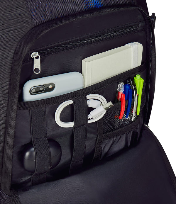 Vordertasche mit Organizerfach. Praktische Innen- und Außentaschen, Taschen und Fächer für Wasserflasche oder Helm.