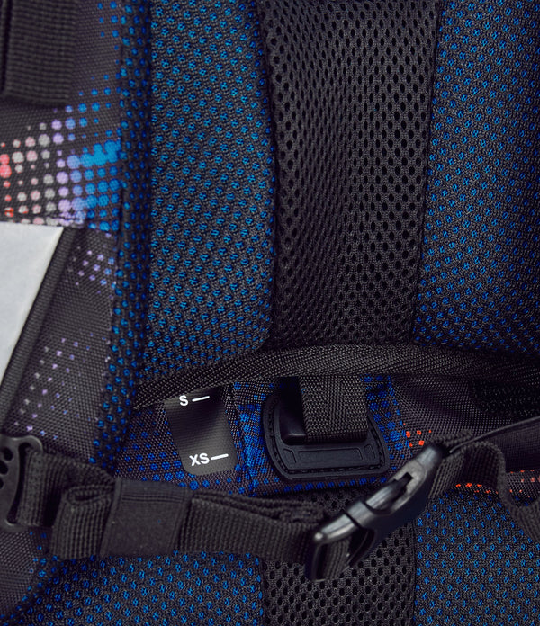 Anatomisch geformte und gepolsterte Schultergurte mit reflektierenden Einsätzen. Innovatives Einstellsystem an den Schultergurten für Körpergrößen von XS bis L. Abnehmbarer Brustgurt. Verstellbarer und abnehmbarer Hüftgurt mit Neigungssystem zur besseren Anpassung an die Bewegungen des unteren Rückens.